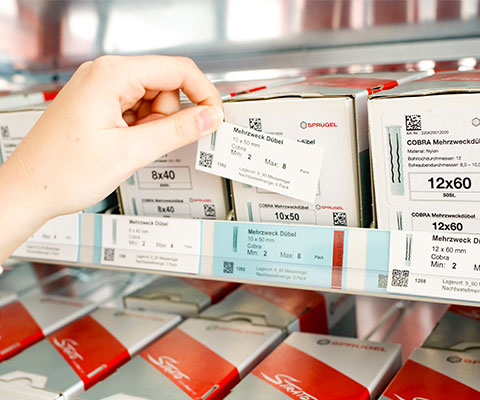 Während die Regalbeschriftung fest am Lagerort bleibt, kann die Bestellkarte herausgenommen werden.